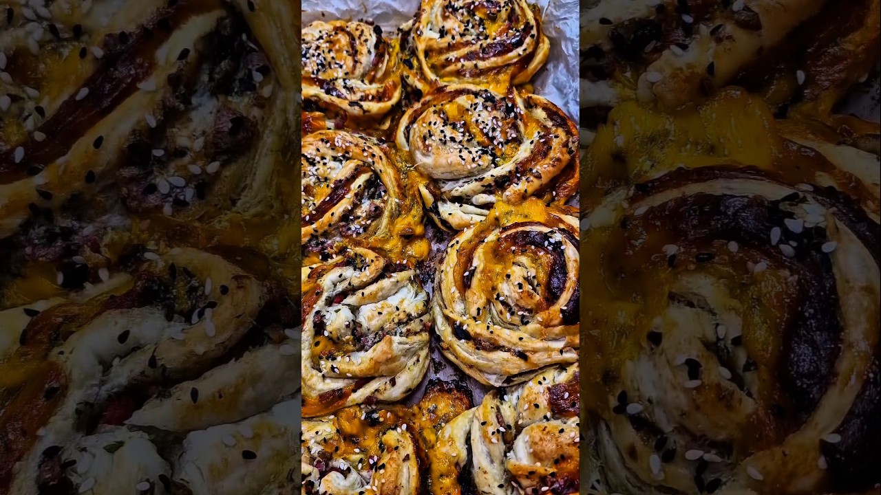 –Spread the filling over the puff pastry sheets, add the cheese, and shape as shown in the video.