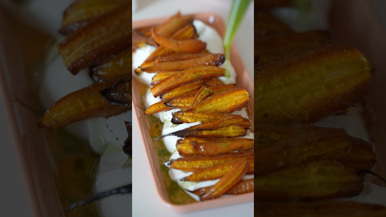 Yoğurt karışımını servis tabağının tabanına yayıp fırınlanmış havuçları yerleştirin.